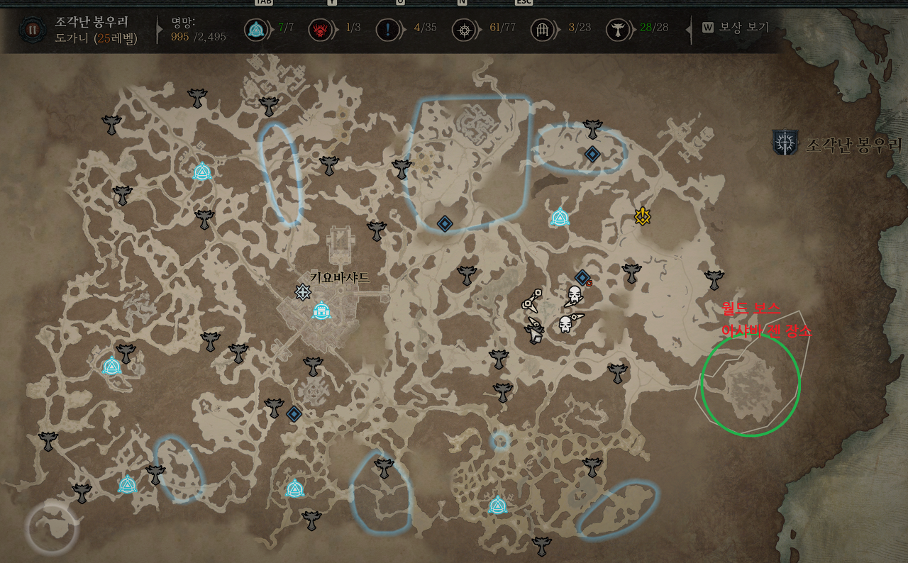 액트 1에는 총 28개의 릴리트 제단과, 7개의 순간이동진이 있습니다. 아래 지도를 참고해서 근처를 탐험하고 있을 때는 제단을 만나 보상을 꼭 얻도록 합시다! 그리고 참고로 월드 보스 젠장소는 오른쪽 구석에 녹색 동그라미 안에 있으니 참고하세요.