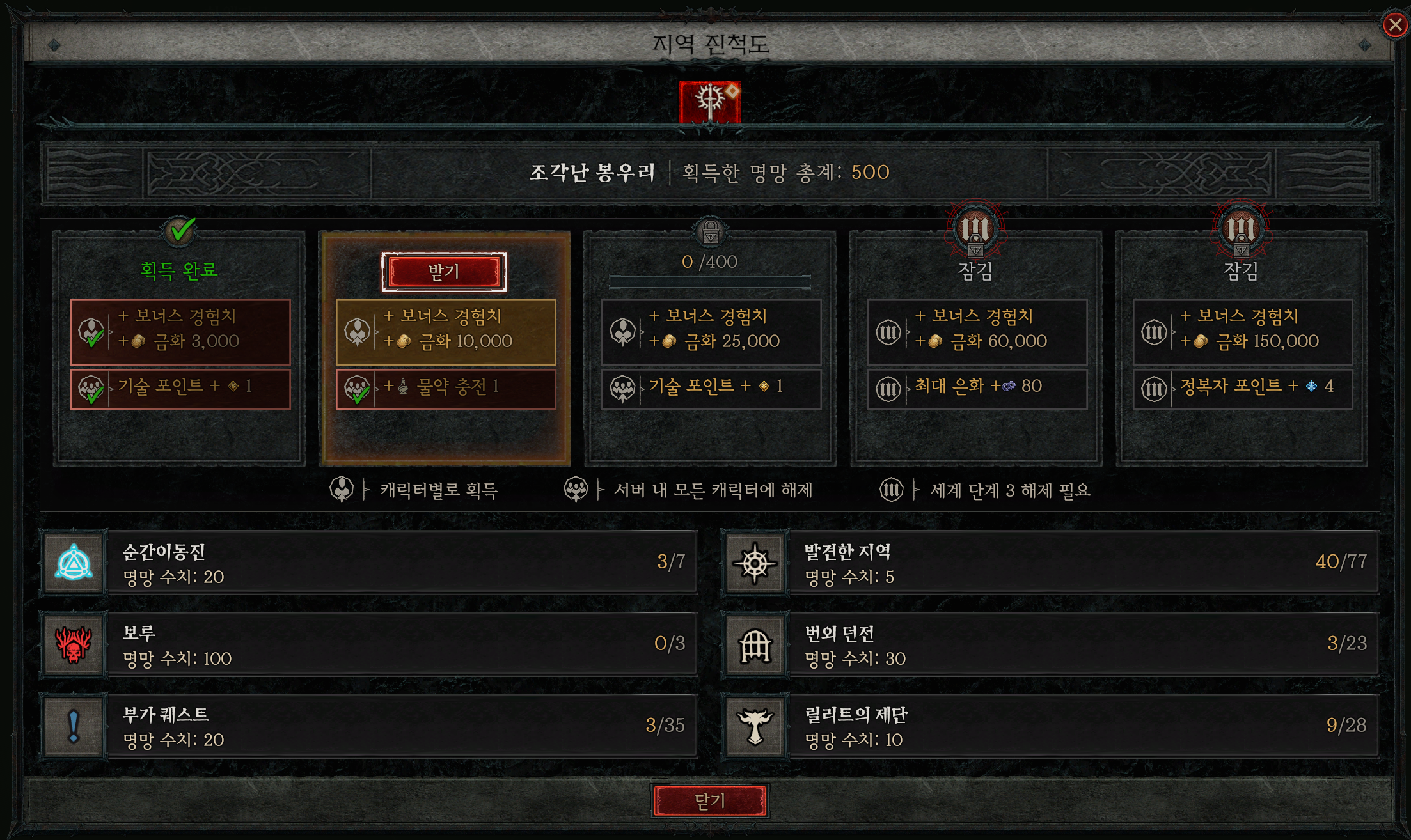 아래는 액트1 지역인 조각난 봉우리의 지역 진척도 화면입니다. 특정 수치의 명망 포인트를 기록할 때마다 받을 수 있는 보상이 있는데요. 중요한 기술 포인트부터 해서 물약 충전, 최대 은화 등 여러 가지 보상이 보입니다. 아래 화면을 참고하시기 바랍니다.