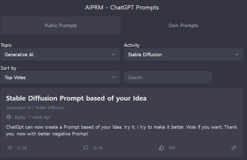 Here's a post about AIPRM for chatGPT : 2023.02.08 - [[TIP] Stable Diffusion] - AIPRM for chatGPT로 Prompt 추출하기