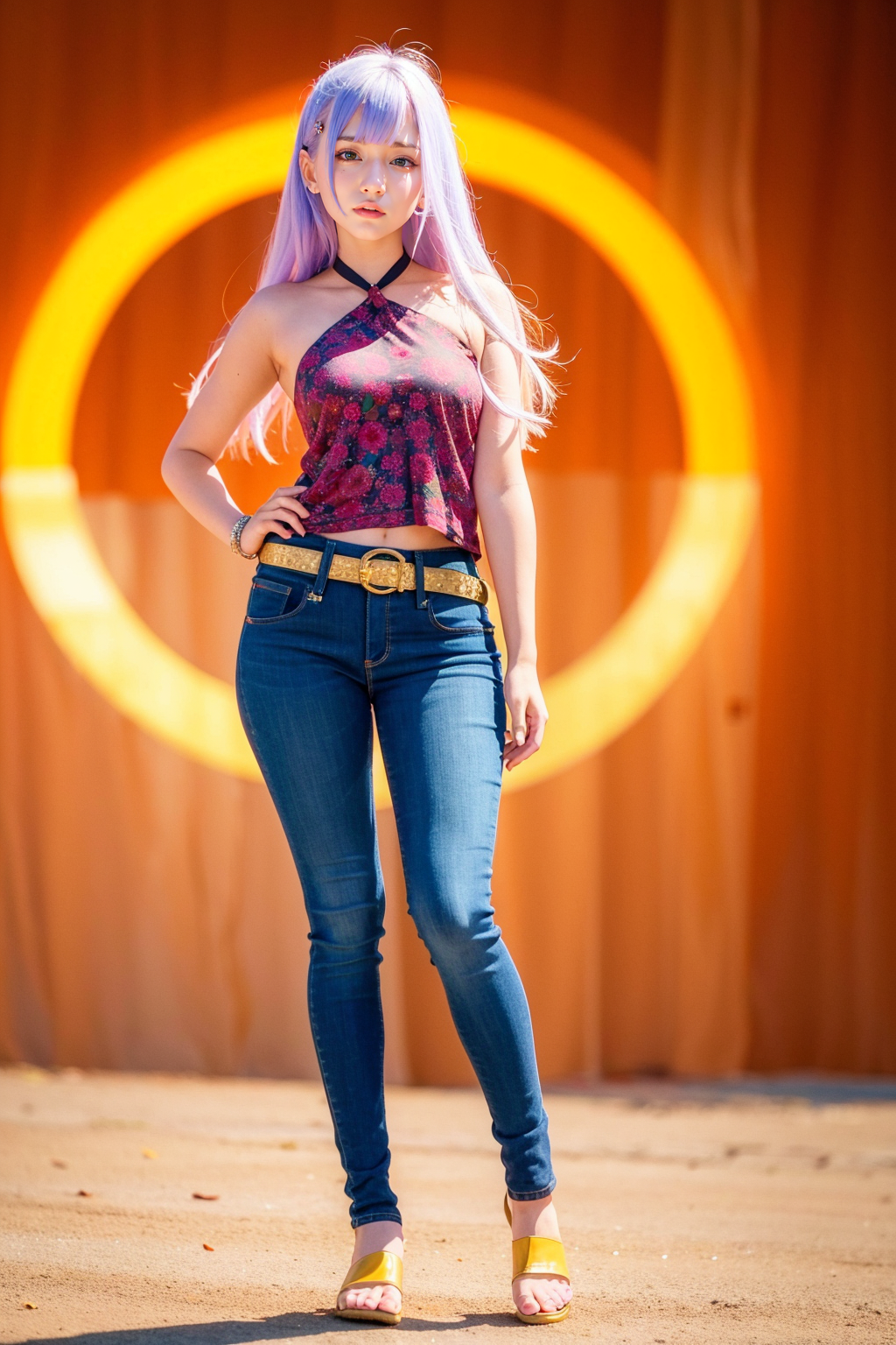 The AI-generated image depicts a young woman standing confidently against an orange sky at sunset. Her long hair falls in loose waves around her bare shoulders, and her bangs frame her face perfectly. She wears a denim halter top that shows off her midriff and a pair of jeans with a brown belt around her waist. Her sandals are adorned with jewelry and her toenails are painted a vibrant shade of orange. The woman looks directly at the viewer with her hand on her hip, exuding a sense of self-assurance and independence. Her earrings add a touch of elegance to the overall look, while her toenail polish and navel piercing demonstrate a playful side. Overall, the AI-generated image is a vibrant and striking portrayal of a confident young woman who is comfortable in her own skin. The orange background and sunset create a warm and inviting atmosphere, making the viewer feel as if they are right there with her.