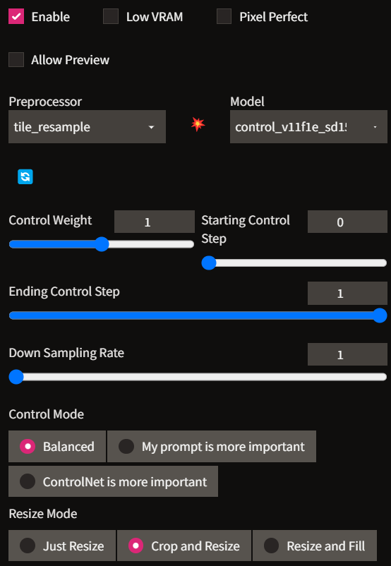 컨트롤넷 설정은 Preprocessor와 Model 둘 다 tile_resample 선택해 주고, 다른 옵션은 건드리지 않았습니다.