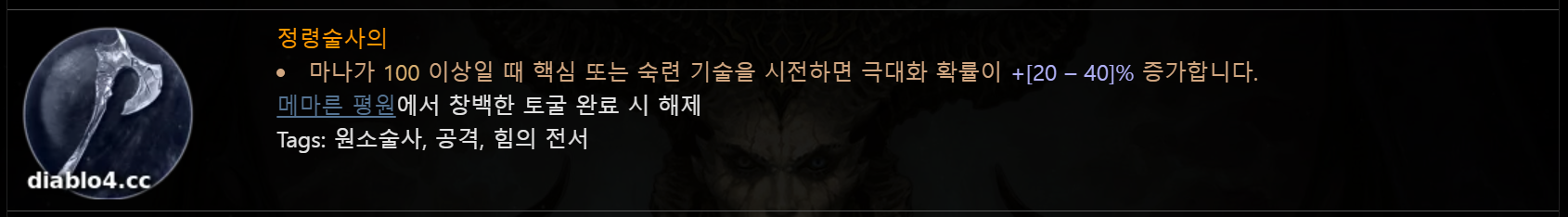 정식 오픈 초반에는 아무래도 드롭으로 전설템을 먹기가 힘들기 때문에 초반부터 얻을 수 있는 전설 위상 던전위주로 추천하겠습니다. 원소술사의 마법 난사와 생존을 위해서는 마법 사용을 위한 마나 유지가 필수입니다.