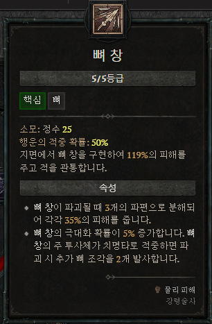뼈파편을 기본 기술로 뼈창을 핵심 스킬로 사용하는 강령술사는 주력 딜링기인 뼈창의 파편이 발사되도록 대미지 상승과 극대화 위주로 스킬을 세팅해 나갑니다.