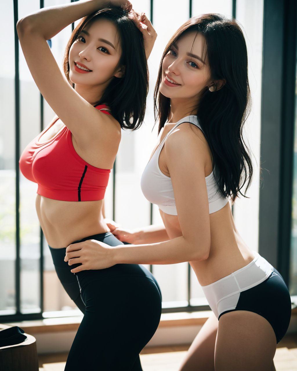 Two beautiful young women stood side by side, exuding confidence and athleticism. Their long, thin black hair cascaded down their backs, accentuating their pretty faces. Dressed in sport bras and shirts, they showcased popular Korean makeup trends, enhancing their natural beauty. With their toned bodies and 3/4 poses, they appeared both strong and graceful.one woman wore boy shorts in a vibrant shade of blue, while the other sported a fiery red pair. Their outfits perfectly complemented their poses, creating a captivating visual display. As they spun gracefully, their movements resembled ethereal angels in motion.