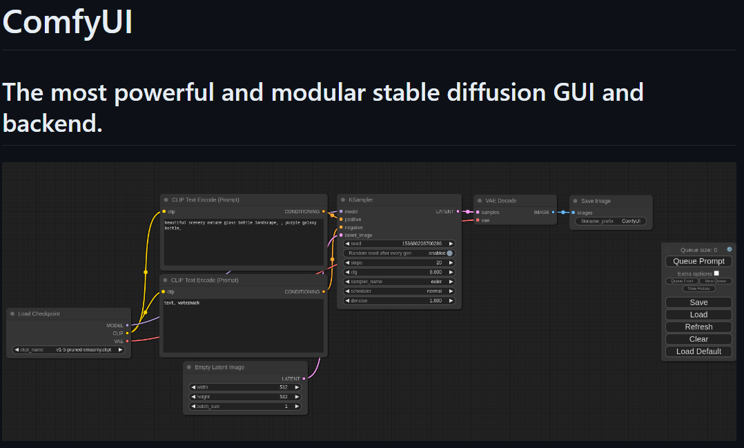 - 직관적인 사용자 인터페이스: ComfyUI는 사용하기 쉬운 노드 기반 시스템을 제공합니다. 이를 통해 복잡한 워크플로우를 시각적으로 쉽게 관리할 수 있어요.