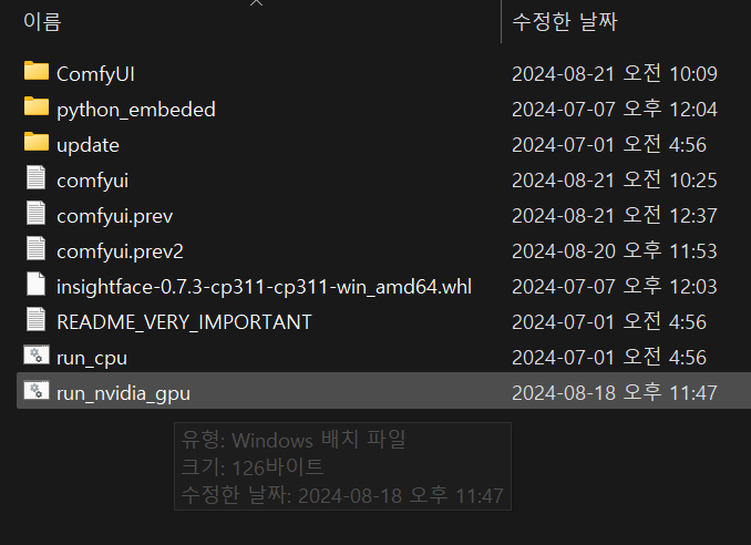 ComfyUI 실행을 위한 배치 파일은 설치된 폴더 루트에 run_cpu.bat 또는 run_nvida_gpu.bat 파일로 존재하는데요. 저는 run_nvidia_gpu를 편집해서 진행했습니다