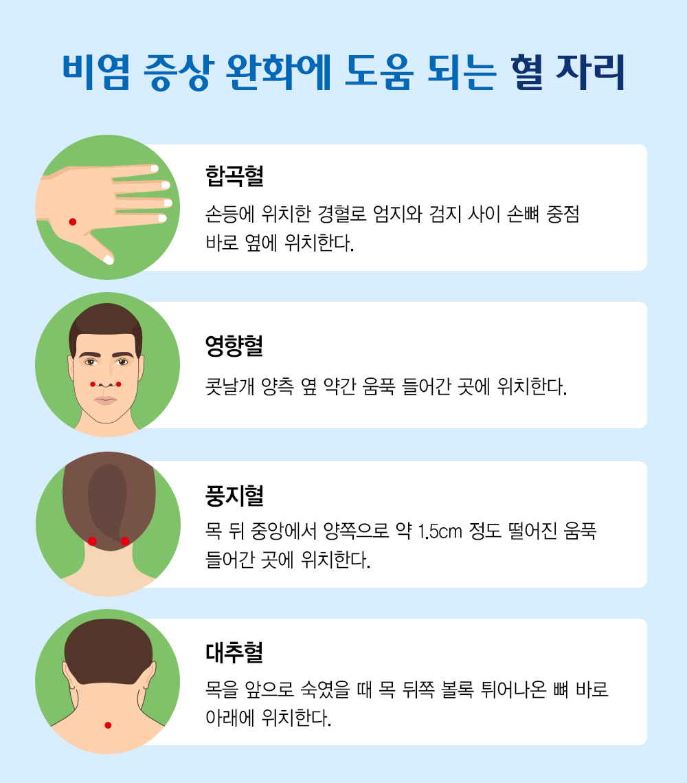 혈자리 지압은 코막힘을 완화하고 호흡을 편하게 해줍니다. 특별한 도구 없이 손쉽게 실천할 수 있습니다.