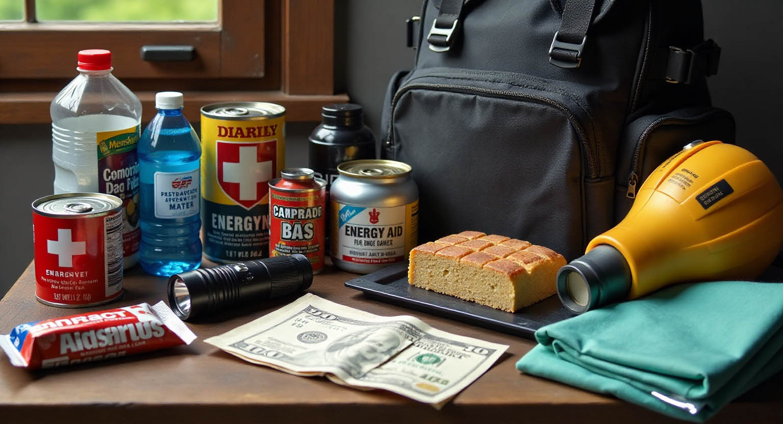 - 기타 생존 도구(호루라기, 플라스틱 시트, 덕트 테이프, 지도와 나침반)