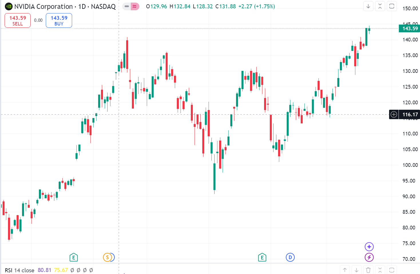 기술적 분석에 따르면 NVIDIA의 주가는 최근 몇 주 동안 강세를 유지하고 있습니다. 현재 50일 이동평균선(MA) 위에서 안정적인 흐름을 보이고 있으며, **상대강도지수(RSI)**는 과매수 상태에 진입해 조정이 있을 가능성을 시사하고 있습니다. 그러나 MACD(이동평균 수렴·발산) 지표는 강한 상승 모멘텀을 유지하고 있어, 중기적 관점에서 추가적인 상승 가능성도 존재합니다【178†source】.