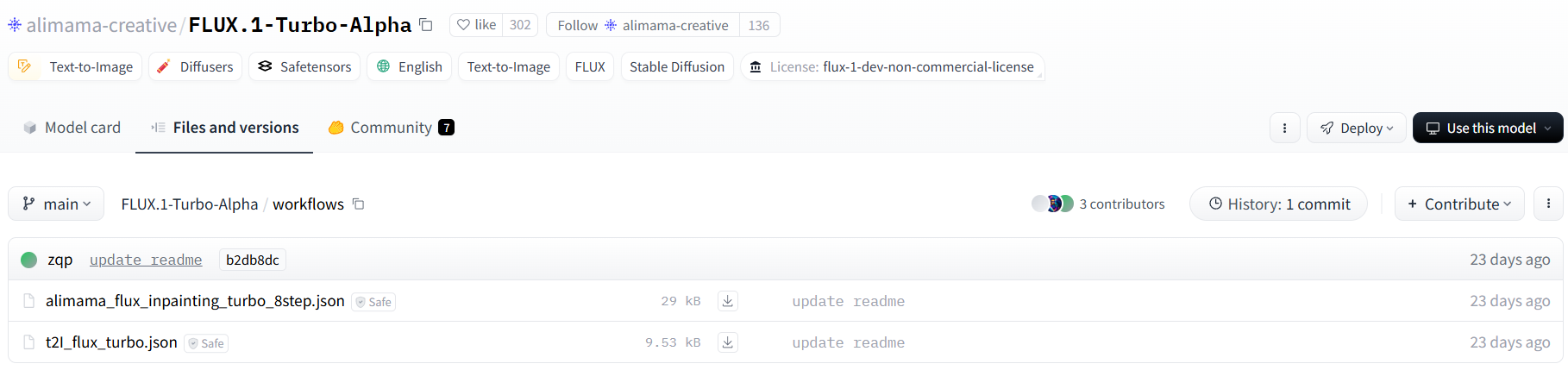 (허깅페이스의 FLUX.1-Turbo-Alpha 페이지로 이동해서 Files and versions 탭에 있는 diffusion_pytorch_model.safetensors 를 다운받으면 됩니다.)