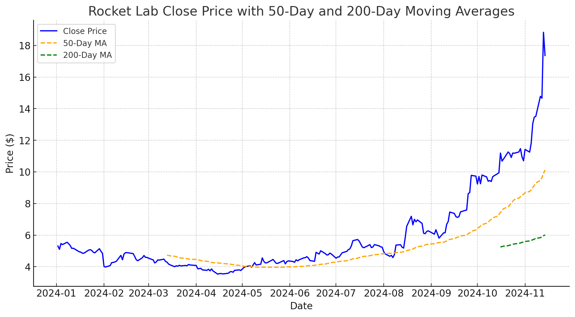 2024년 11월 14일 기준, 로켓랩의 주가는 17.36달러로 마감하였으며, 최근 단기적인 급등세를 보이고 있습니다.