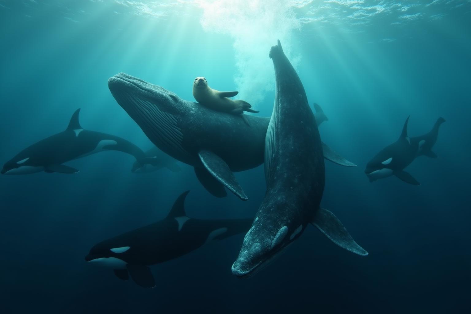 혹등고래가 보여준 이타적 행동은 인간에게만 국한되지 않습니다. 인간을 구한 사례처럼, 다른 해양 생물들에게도 그들의 이타심은 빛납니다. 2016년 알래스카 연안에서는 새끼 바다사자가 범고래 떼에 쫓기고 있었습니다. 새끼 바다사자는 사력을 다해 도망쳤지만, 점점 좁혀오는 포위망에 절망하고 있었죠. 그 순간, 마치 바다의 천사처럼 혹등고래 무리가 나타났습니다.