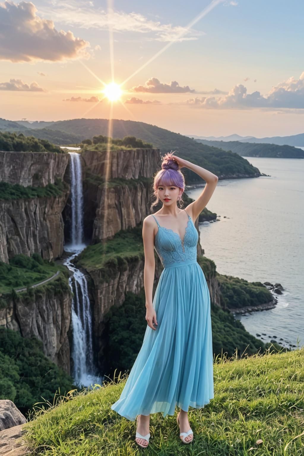 As the sun dipped below the horizon, painting the sky in hues of gold and lavender, she stood on the cliff's edge, her dress swaying gently with the breeze. Behind her, the mighty waterfall cascaded endlessly, its roar softened by the tranquil melody of nature. She felt like a character from a forgotten legend—a keeper of dreams, standing at the juncture of land and water, of day and night.