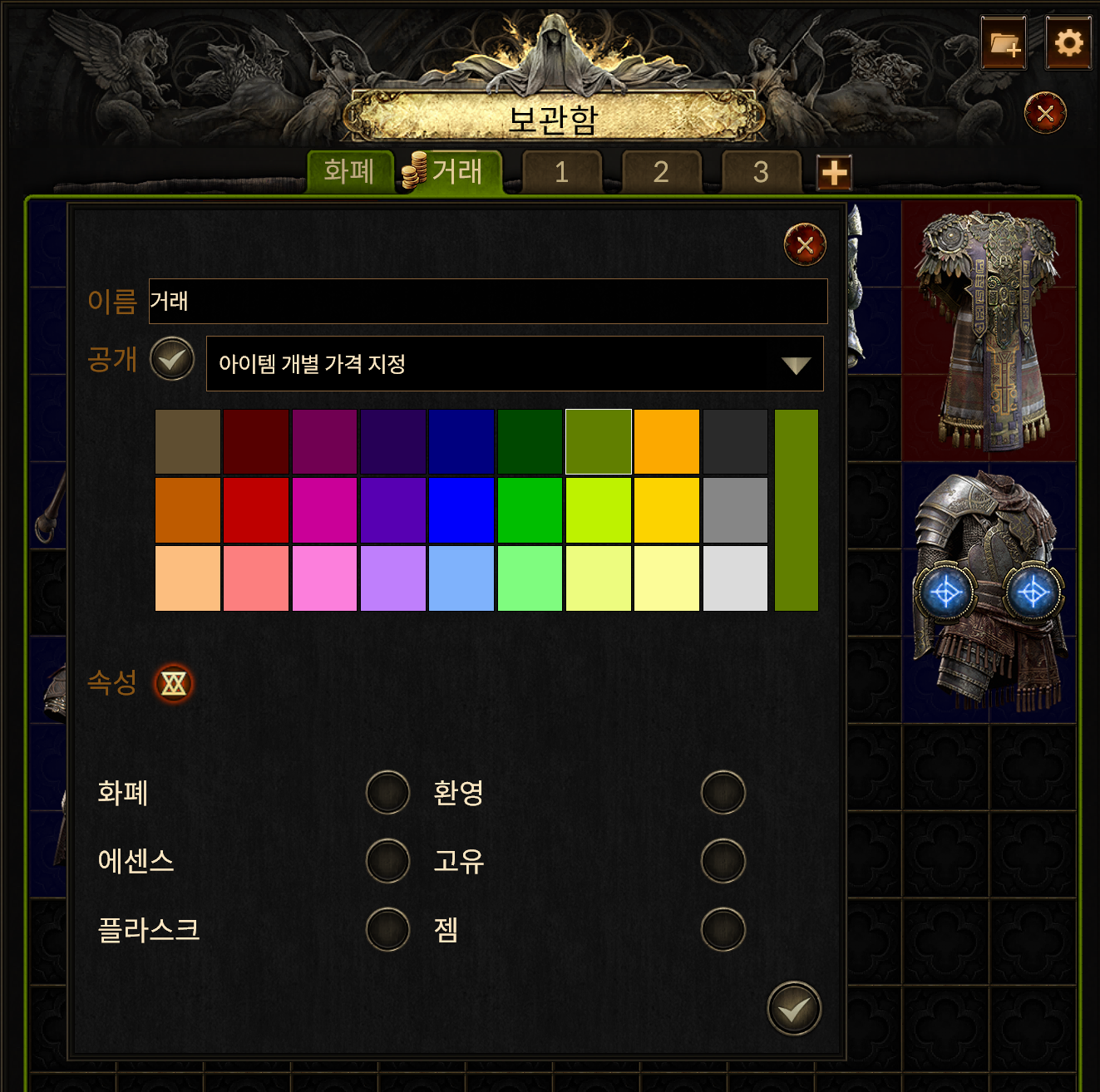 - 판매할 아이템을 프리미엄 보관탭으로 이동합니다.판매용 아이템과 보관용 아이템이 섞이지 않도록 탭을 정리하고, 탭 이름과 색상을 설정해 구분하세요.