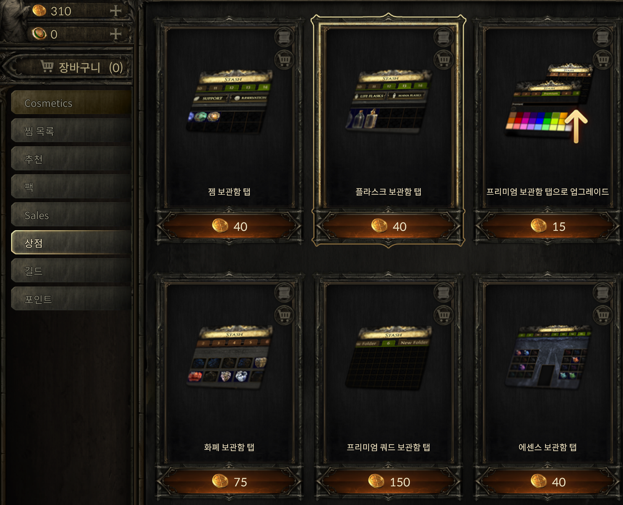 - 게임 내 상점에서 구매하거나 기존 보관탭을 업그레이드합니다.