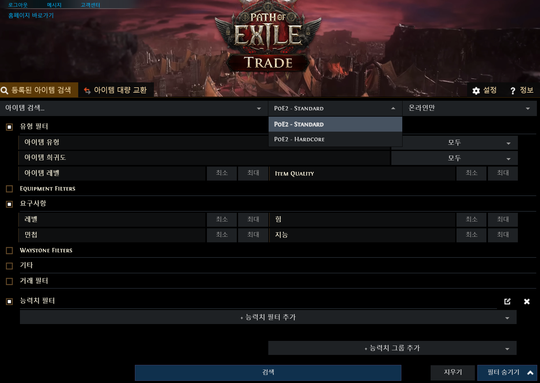 - POE 계정 연동: 공식 계정으로 로그인해야 거래소를 사용할 수 있습니다.