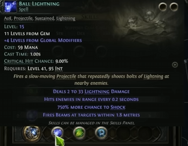 - 구형 번개(Ball Lightning): 적에게 지속적인 번개 피해를 입히는 투사체 스킬. 투사체 속도를 낮추어 더 많은 적중 효과를 발생시킵니다.