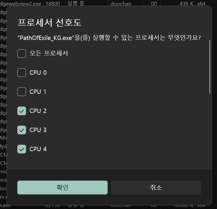 POE2 실행상태로 작업관리자 > PathOfExile_KG 세부정보로 이동 > PathOfExile_KG.exe 오른클릭으로 선호도 설정 > CPU 0, CPU 1 체크해제