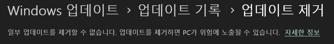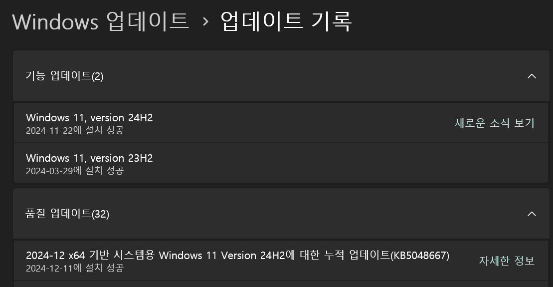 - Windows 설정 > 업데이트 및 보안 > 업데이트 기록에서 'KB5048667' 업데이트 여부를 확인합니다.