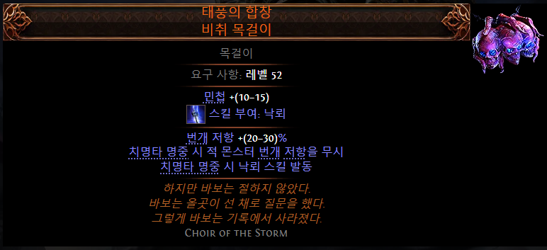 - 태풍의 합창 비취 목걸이 (Choir of the Storm Jade Amulet) 조정: 기존 ‘낙뢰’ 스킬이 ‘그레이터 라이트닝 볼트’로 변경되며, 지팡이의 ‘낙뢰’와 구분됨.