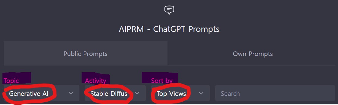 "Public Prompts" 내 세부 카테고리 정하는 메뉴에서 TOPIC은 "Generative AI", Activity는 사용하는 AI영상 제작 툴에 맞게 선택해줍니다. 저는 "Stable Diffusion"을 선택하겠습니다. Sort by는 view, vote, update 기준으로 정렬할 수 있습니다. 저는 "Top Views"로 선택하겠습니다.