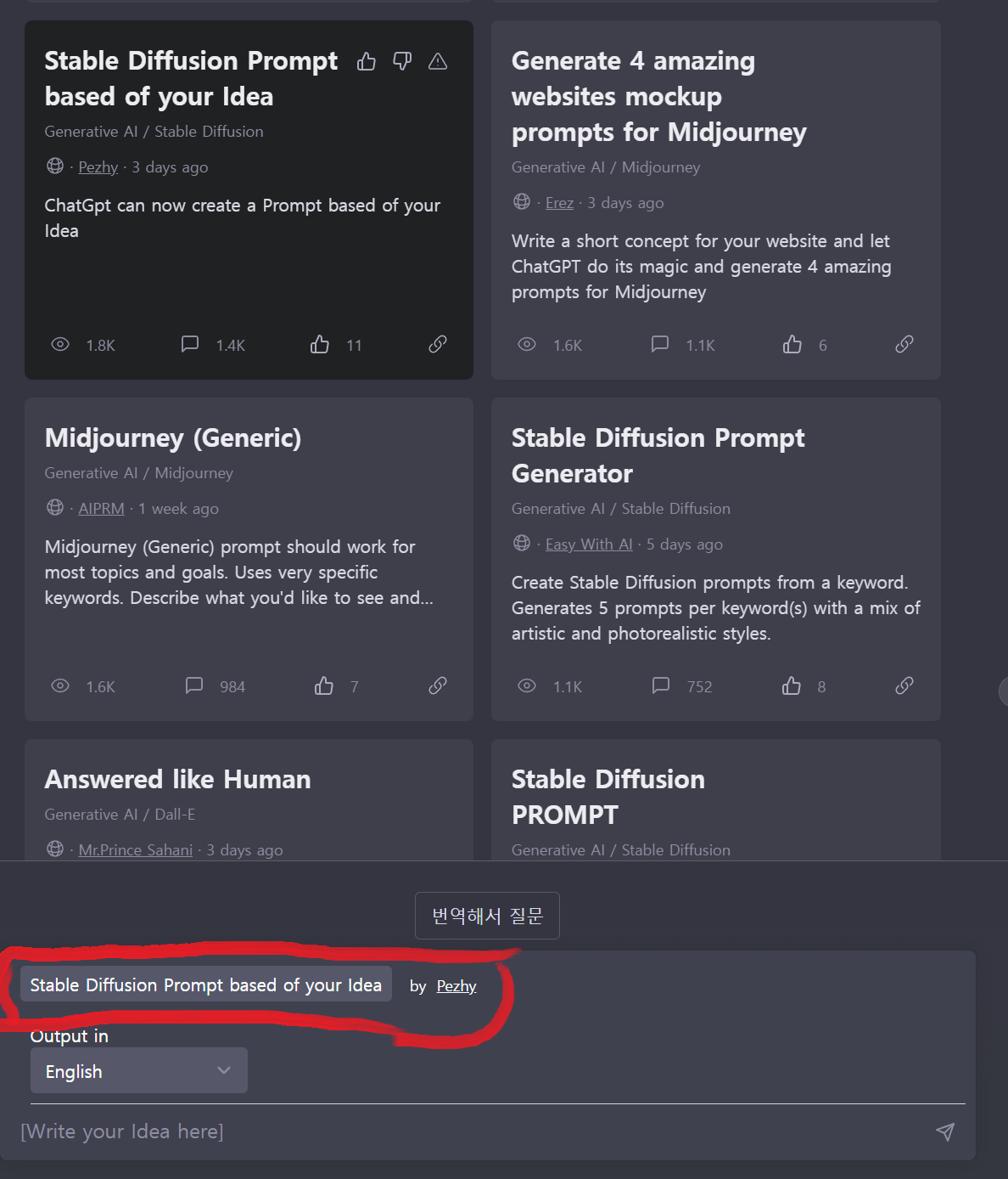 저는 Stable Diffusion을 사용하므로 관련 내용이 있는 "Stable Diffusion Prompt based of your Idea"를 선택하겠습니다.
