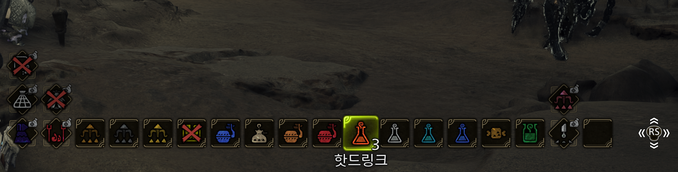 옵션 → 조작 탭 → 확장 모드 전환 조작 - 타입 3으로 하면 LB + RB를 누르면서 스틱을 움직이면 아이템이 선택 가능하나 무기 납도 후 달리면서 아이템을 사용하면 확장모드가 열리게 되어 불편할 수 있으니 취향껏 본인이 편한 키로 설정하는 것을 추천