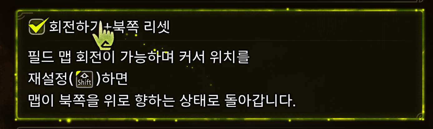 옵션 → 게임 설정 → 2번째 탭 → 필드맵 회전 설정 → 회전하기 + 북쪽 리셋 - 필드맵 조작 중 키보드는 Shift 키 / 게임패드는 LS 버튼을 누르면 북쪽으로 리셋 가능.