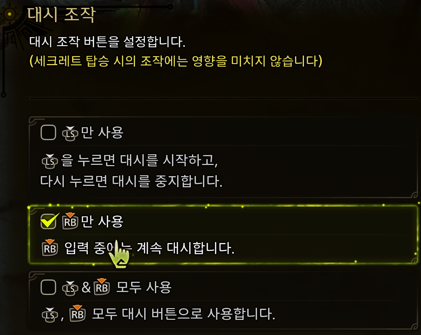 - 설정 방법: 옵션 → 조작 탭 → 대시 조작 설정 → RB 누르기만 사용