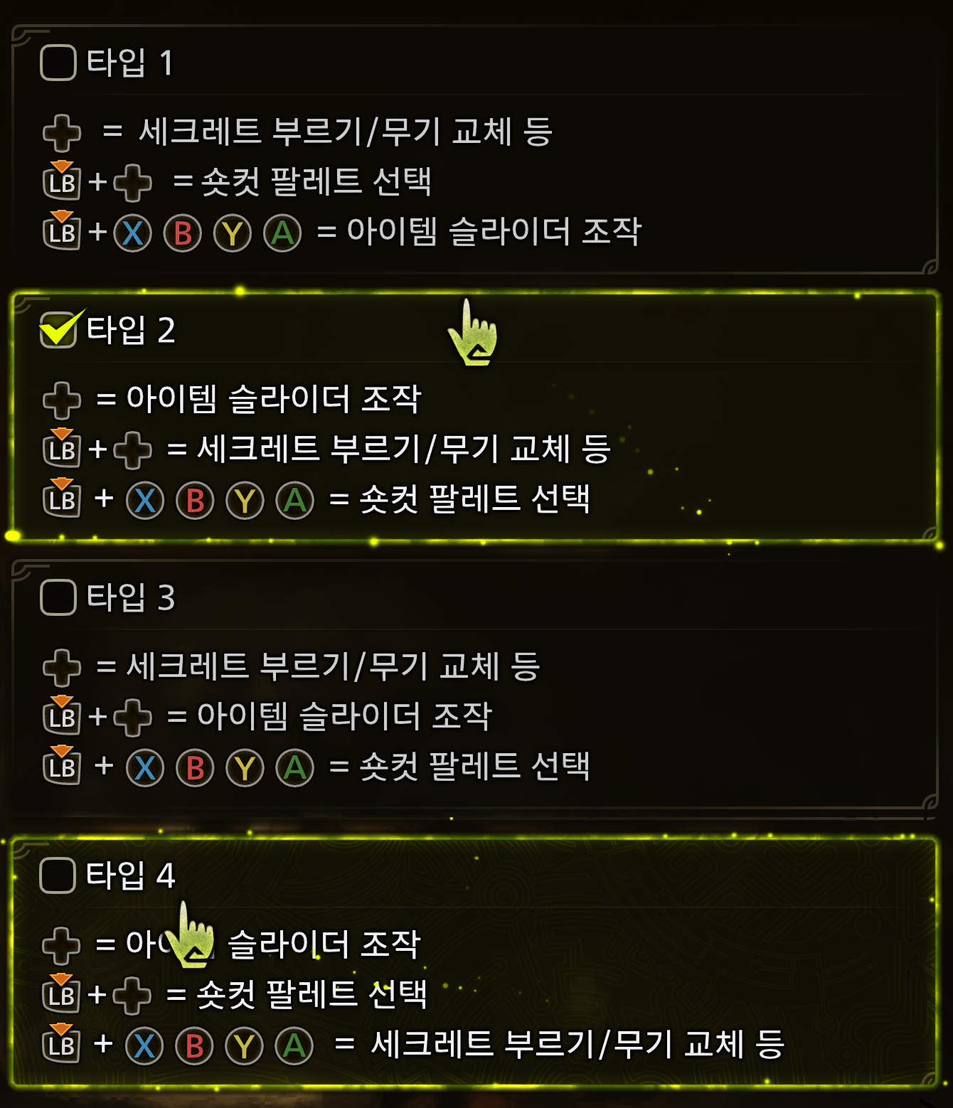 - 조준 방향 & 타입 설정 (카메라 탭 3페이지): 타입 4 선택 시 LT 버튼 하나로 집중 모드와 타겟 카메라를 동시에 발동 가능.