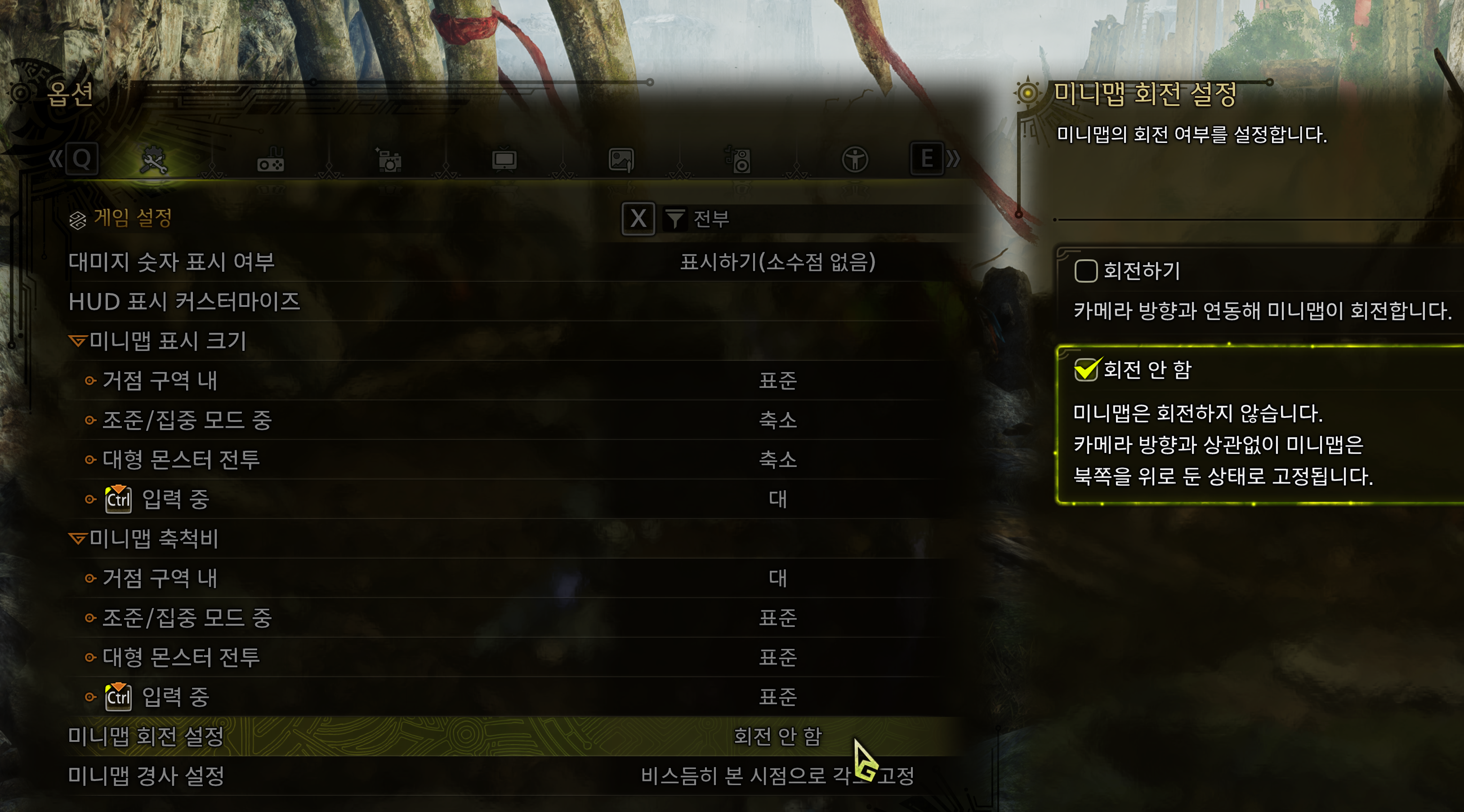 옵션 → 게임 설정 → 미니맵 경사 설정 → 정상에서 본 시점으로 각도 고정