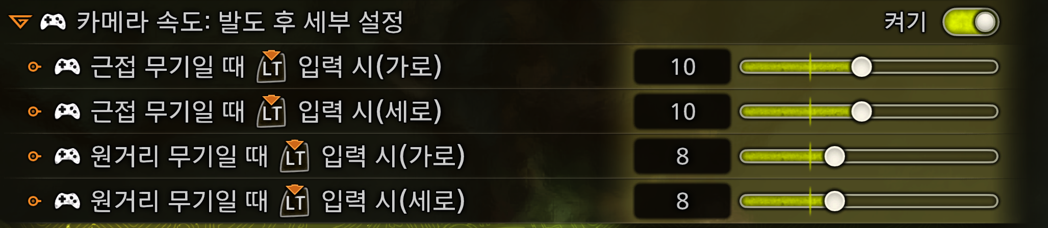 옵션 → 카메라 탭 → LT 입력 시 카메라 속도 → 10 (사용자 설정 가능)- 원거리 무기와 근거리 무기를 개별적으로 조정 가능.