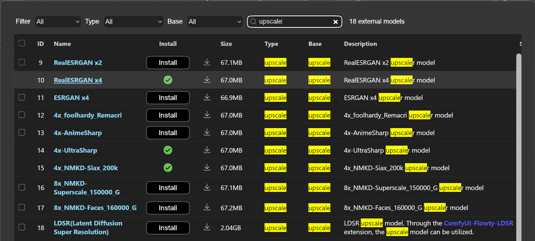 ComfyUI Manager > model manger 를 통해 다운로드 가능한 업스케일러 리스트