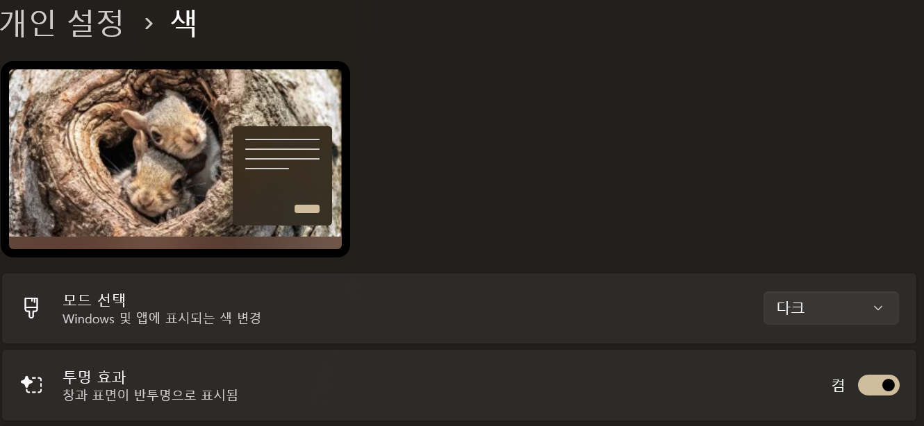 | 투명 효과 | 개인 설정 > 색 | GPU 자원 절감 |