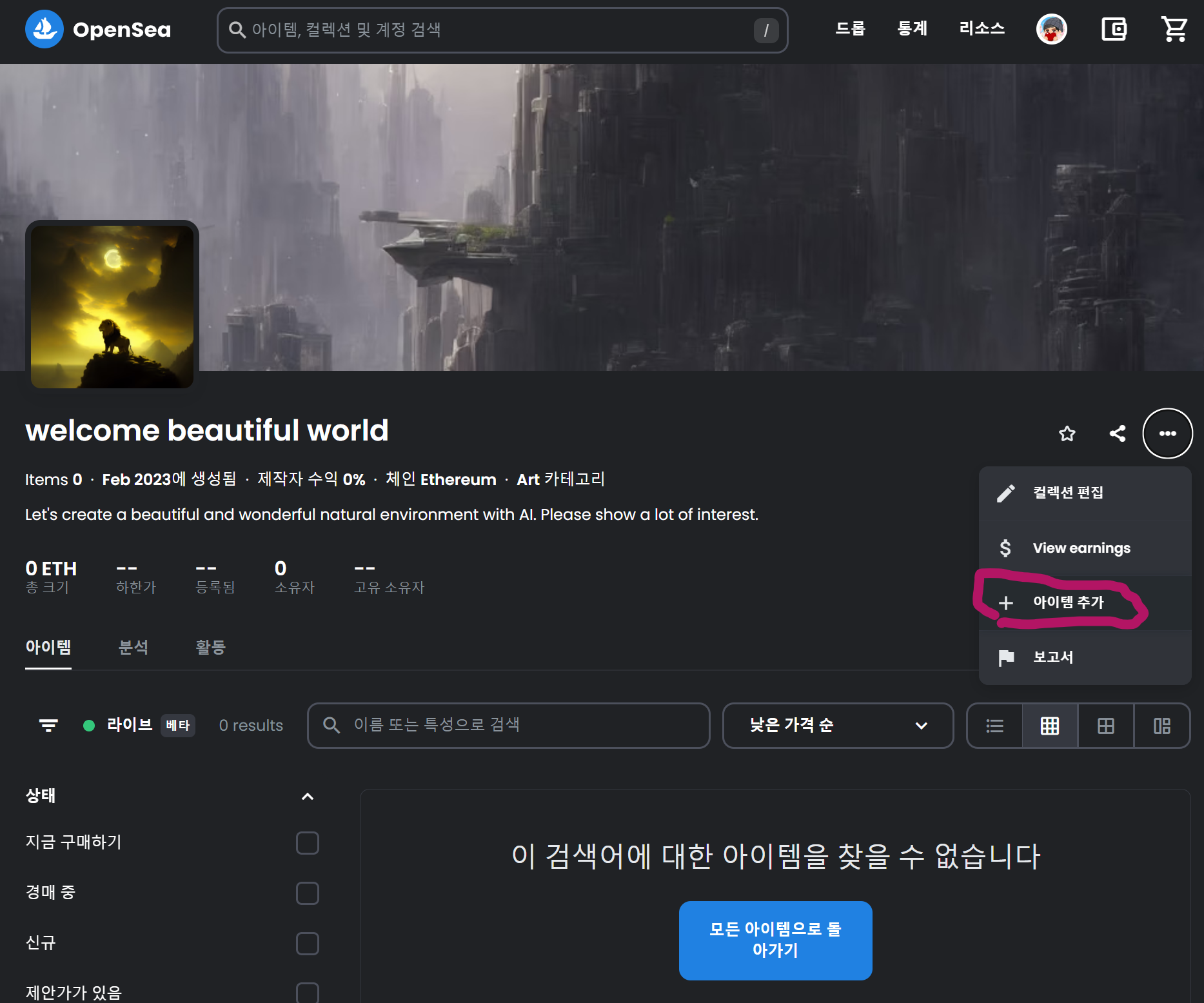 컬렉션이 생성된 화면이고요, 여기서 제작한 그림이나 여러 아이템을 등록할 수가 있어요.