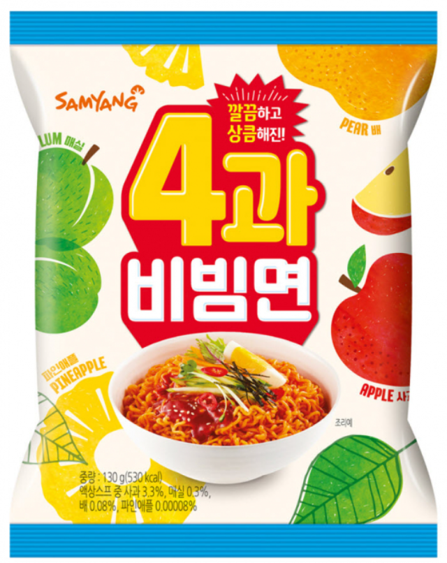 - 삼양 4과비빔면: 태양초 고추장을 기반으로 사과, 매실, 배, 파인애플 4가지 과일의 풍미를 담아낸 제품입니다. 소스는 깔끔하고 상큼하며, 과일의 자연 단맛이 강조됩니다. 면은 비교적 중간 굵기로 소스와의 조화를 중시해 제작됩니다.