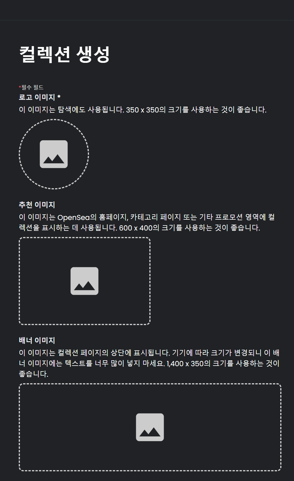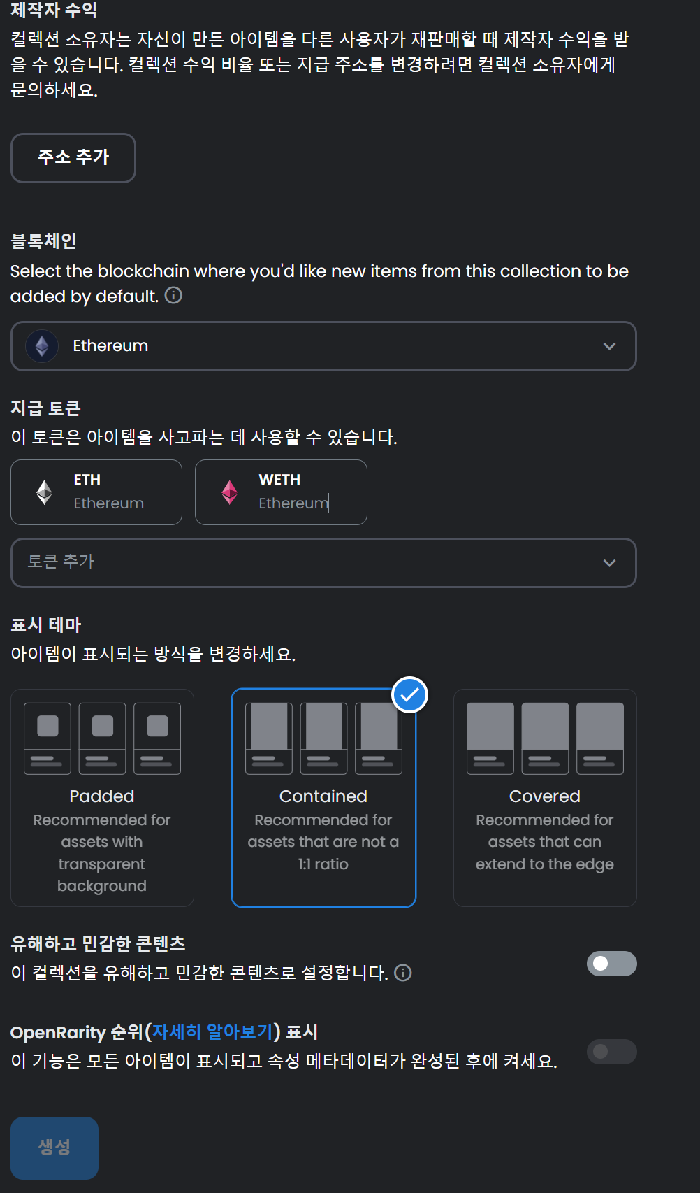 서명까지 하면 컬렉션 상세 설정 화면이 나오네요. 컬렉션에 세부 설정을 다 세팅을 해주면 가장 하단 파란색 생성버튼이 활성화되고 해당 버튼을 누르면 생성할 수가 있습니다.