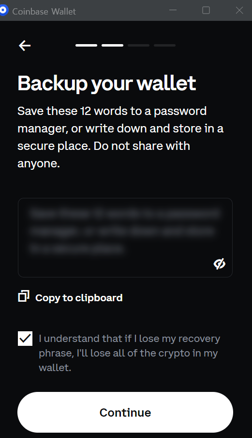 새로운 지갑을 눌러주면 보안을 위해 보안 텍스트를 설정해야 된다며 표시되는 것을 볼 수 있습니다. 이것을 복사해서 잘 보관합니다. 저는 Windows 기본 메모장에 복사해 뒀습니다. (나중을 위해 여기저기 잘 저장해 두시기 바랍니다.)