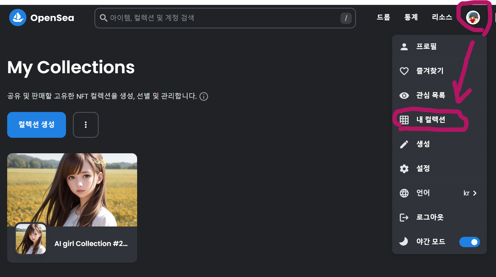 생성하기 위한 세부설정을 다 입력하고 최종 생성을 눌러주면 컬렉션 화면에 방금 등록 NFT 자산을 볼 수 있습니다.