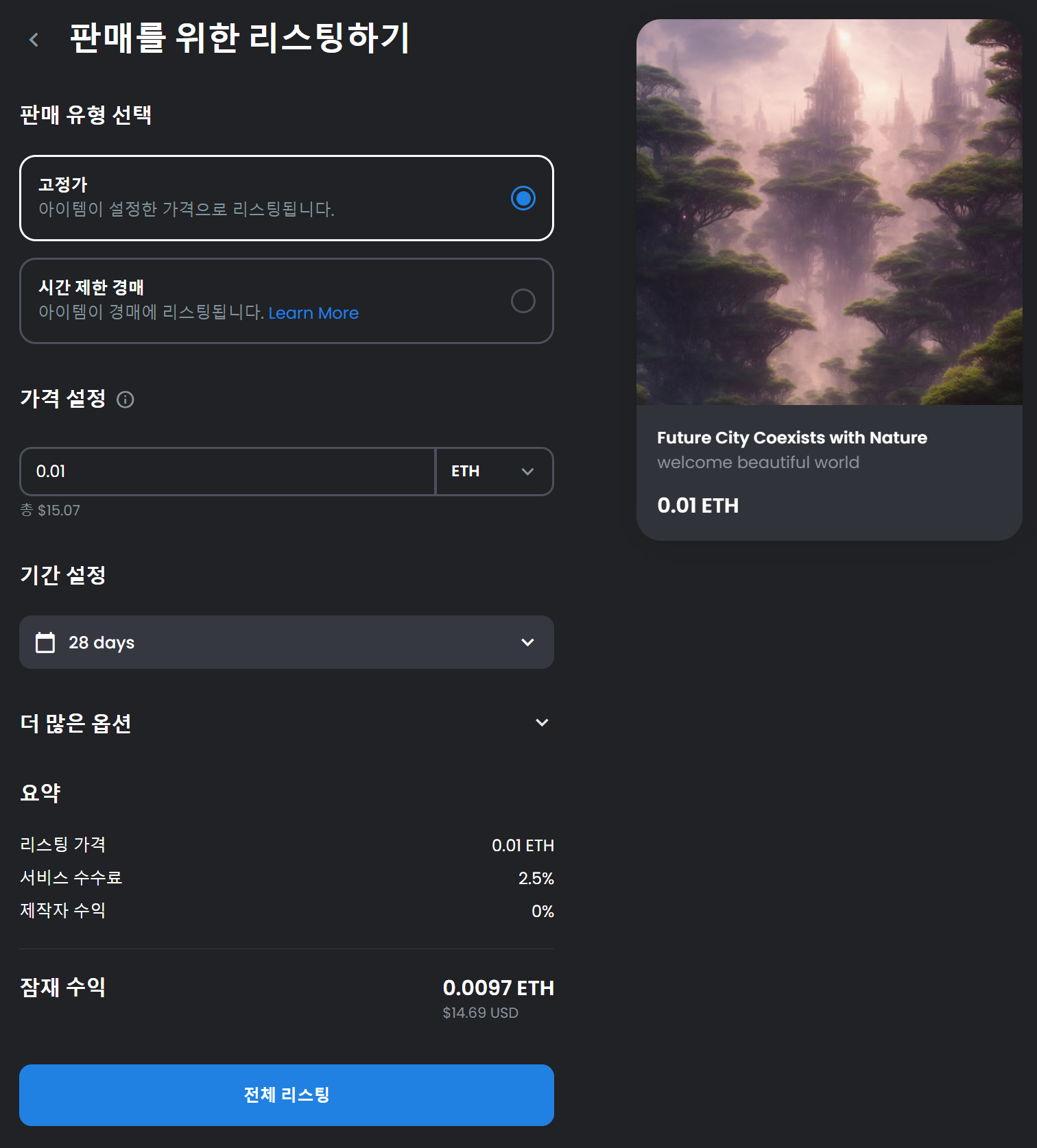 여기서는 아이템을 고정가로 판매할 것인지 아니면 시간제한을 두고 경매를 진행할 것인지 정할 수 있습니다. 가격은 이더리움 화폐로 설정이 가능하네요. 저는 고정가에 0.01 ETH로 28 days 설정했습니다. 잠재수익이 14.69달러로 표시되네요. 가만히 앉아 28일 안에 제 작품이 팔리는 꿈같은 상상을 해봅니다. (꿈은 이루어진다!)
