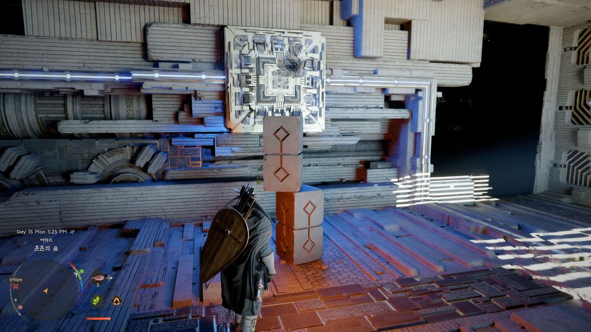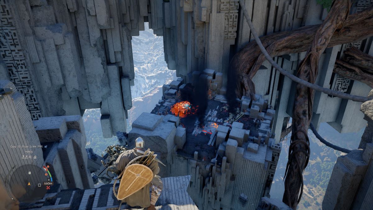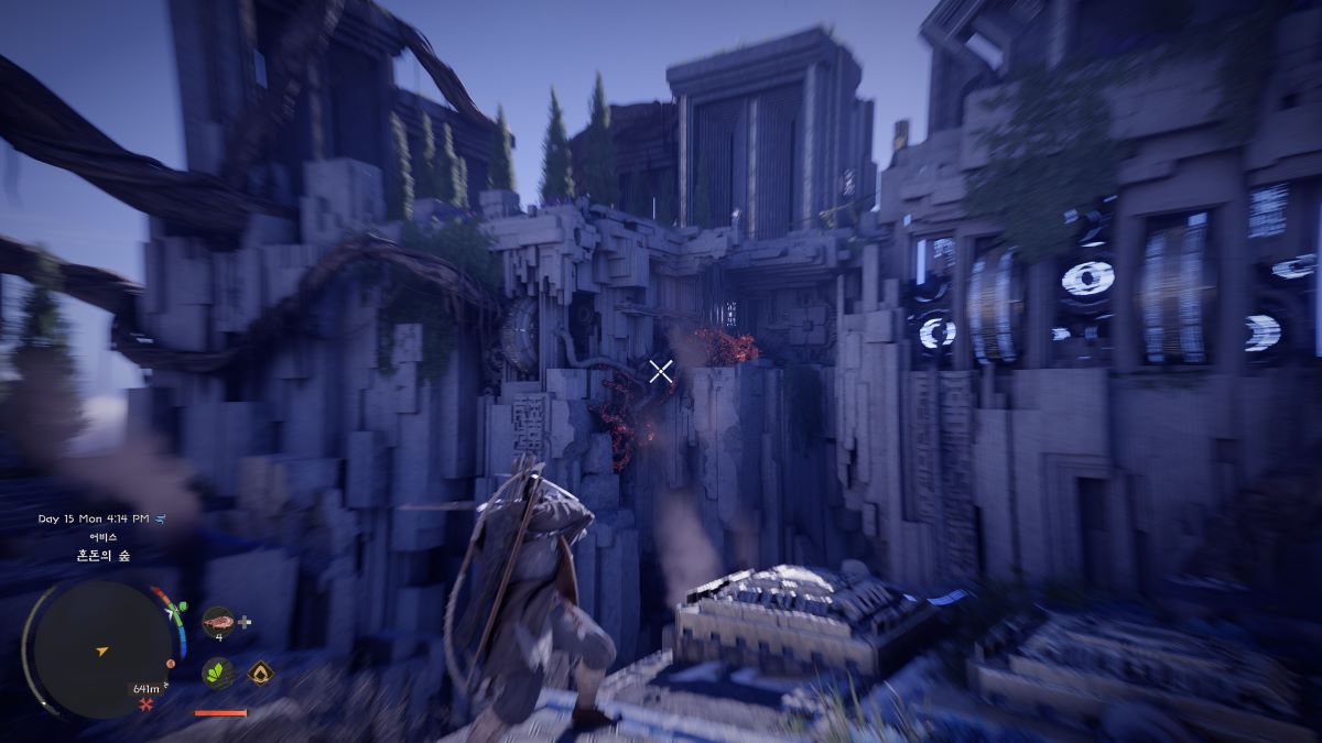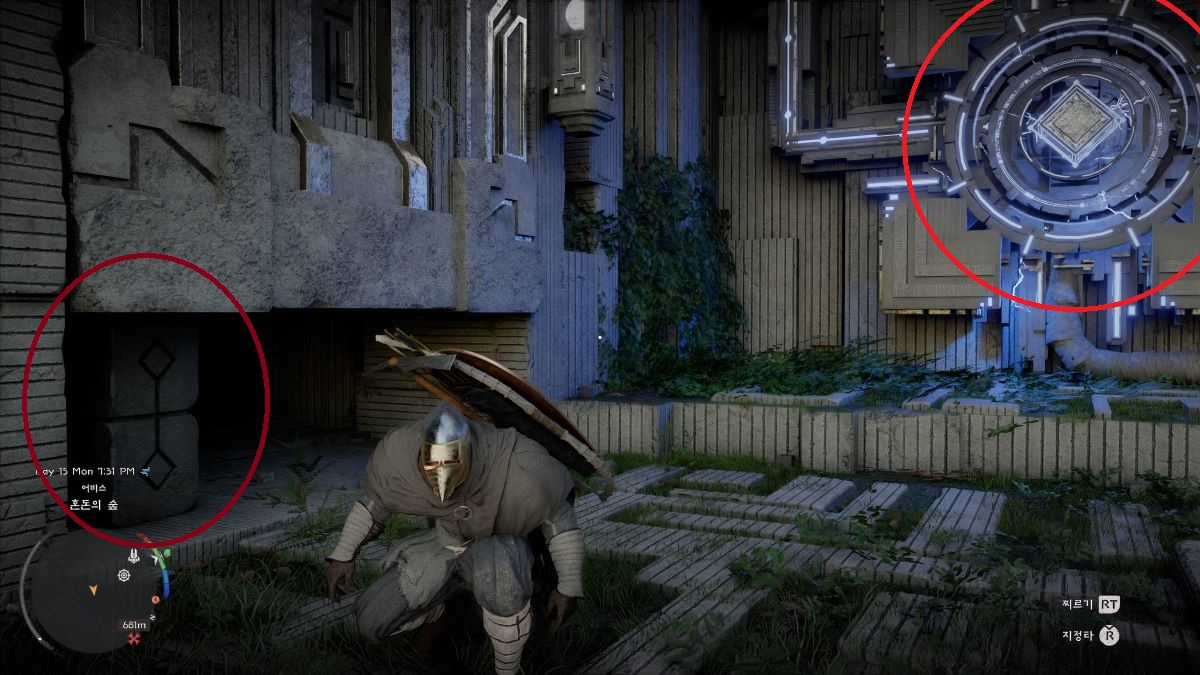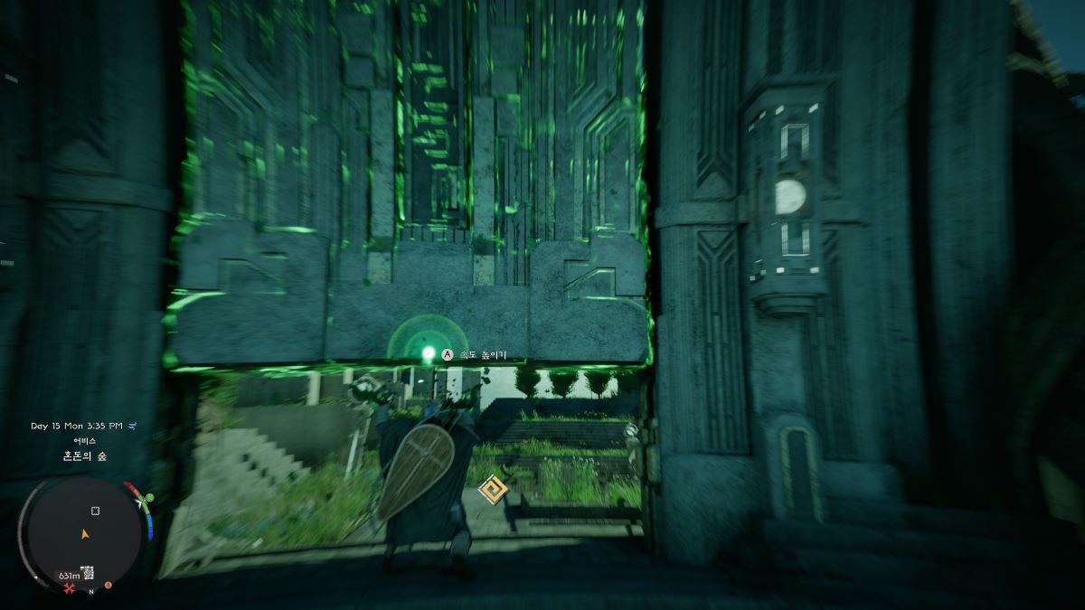 혼돈의 숲에 도착하면 거대한 석조 건축물과 계단이 정면에 보인다. 중앙의 닫힌 석문 앞에 서서 주변 지형을 먼저 파악하자.