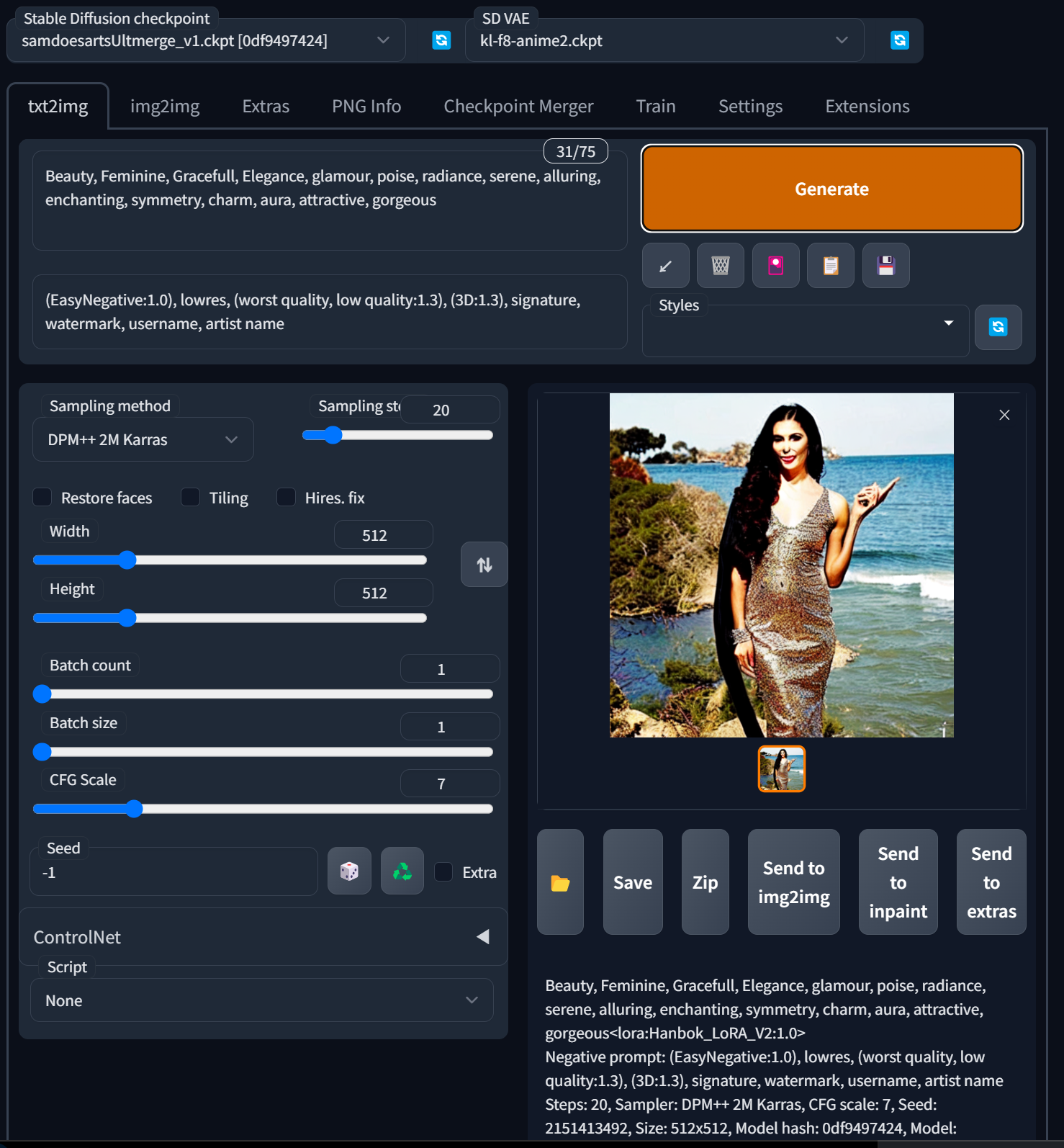 이 상태에서 다시 돌리면 이제 그림이 변화가 없고 고정되어 있는 것 보실 수 있습니다. 다시 랜덤으로 돌리시려면 '-1'을 다시 넣으시면 됩니다. 이제부터 프롬프트를 넣거나 빼면서 또는 Sampling steps와 CFG Scale을 미세하게 바꾸면서 변화를 관찰하는 겁니다. 내가 마음에 드는 결과 나올 때까지요. 하나씩 옵션을 변경하면 멋지거나 혹시 그 반대로 변화하는 모습을 보실 수 있을 거예요
