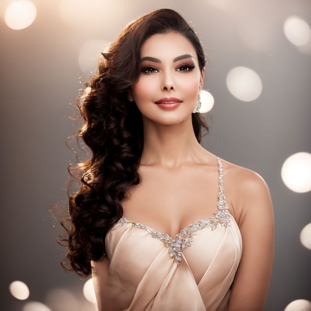 Postive Prompt : Beauty, Feminine, Gracefull, Elegance, glamour, poise, radiance, serene, alluring, enchanting, symmetry, charm, aura, attractive, gorgeous, detailed beautiful face, looking_at_viewer, by SUNRISE_Studios, glow white particles