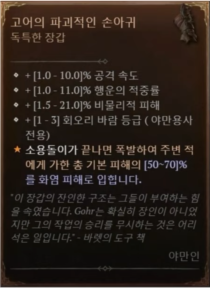 엔드 게임 시 세팅해야하는 야만용사 고유템 목록입니다