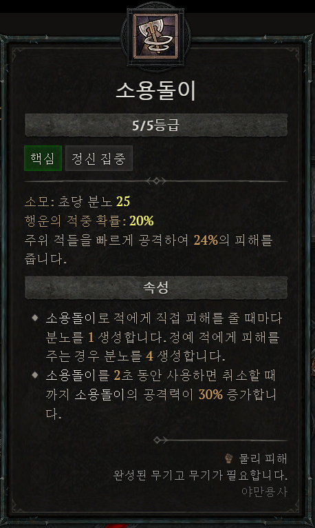 야만용사의 마스코트 스킬이기도 한 소용돌이가 핵심 스킬입니다. 소용돌이 스킬은 여러 몹을 타격하면서 동시에 이동이 가능한 스킬로 사용중에는 몹들 사이에 갇히는 일이 없을 것입니다. 전설템 위상을 잘 사용하고 왕성한 분노 등 분노 재생과 관련된 스킬을 업그레이드해서 무한으로 소용돌이 스킬을 쓸 수 있도록 초점을 맞췄습니다. 잡몹은 소용돌이 광역으로 처리하고 선조의 부름과 결정타를 사용해서 정예몹이나 보스를 상대하면 됩니다.