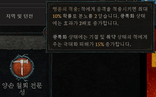 초반에는 각 핵심기술 위주로 찍어나가고 후반에는 핵심 스킬을 강화하는 방향으로 찍어줍니다. 무기 전문화는 양손 철퇴 전문성을 찍었습니다. 마찬가지로 소용돌이 빌드는 분노 수급이 중요하기 때문에 분노 획득과 광폭화 상태에서 극대화 피해를 통해 효율성을 중시하여 선택했습니다.