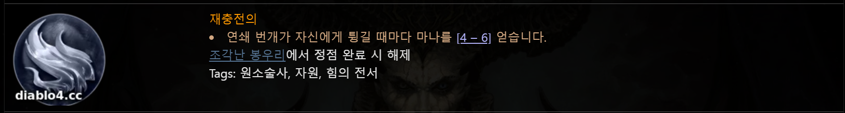 원소술사 번개 빌드에서 부족한 마나를 보충할 수 있는 필수적인 위상입니다. 본인에게 연쇄 번개가 튕기면 최대 6의 마나를 얻을 수 있으며, 잡몹 처리 시에는 효율이 약간 떨어질 수 있으나 단일로 상대할 가능성이 큰 엘리트 몹이나 보스전 진행 시 상당한 양의 마나를 보충할 수 있어 딜 상승에 지대한 공헌을 하는 위상입니다. 게다가 초반에 조각난 봉우리로 진행하는 것이 유리합니다.