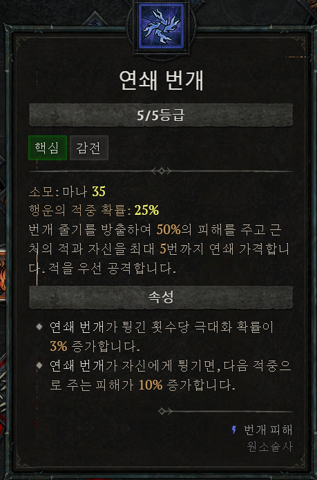 - 핵심 : 연쇄 번개 5, 강화된 연쇄 번개, 상급 연쇄 번개