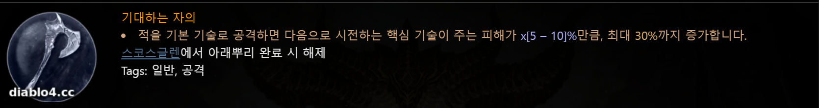 전 직업 공용 위상으로 스코스글렌에서 획득 가능하며 핵심 스킬의 대미지를 올려주는 위상입니다.