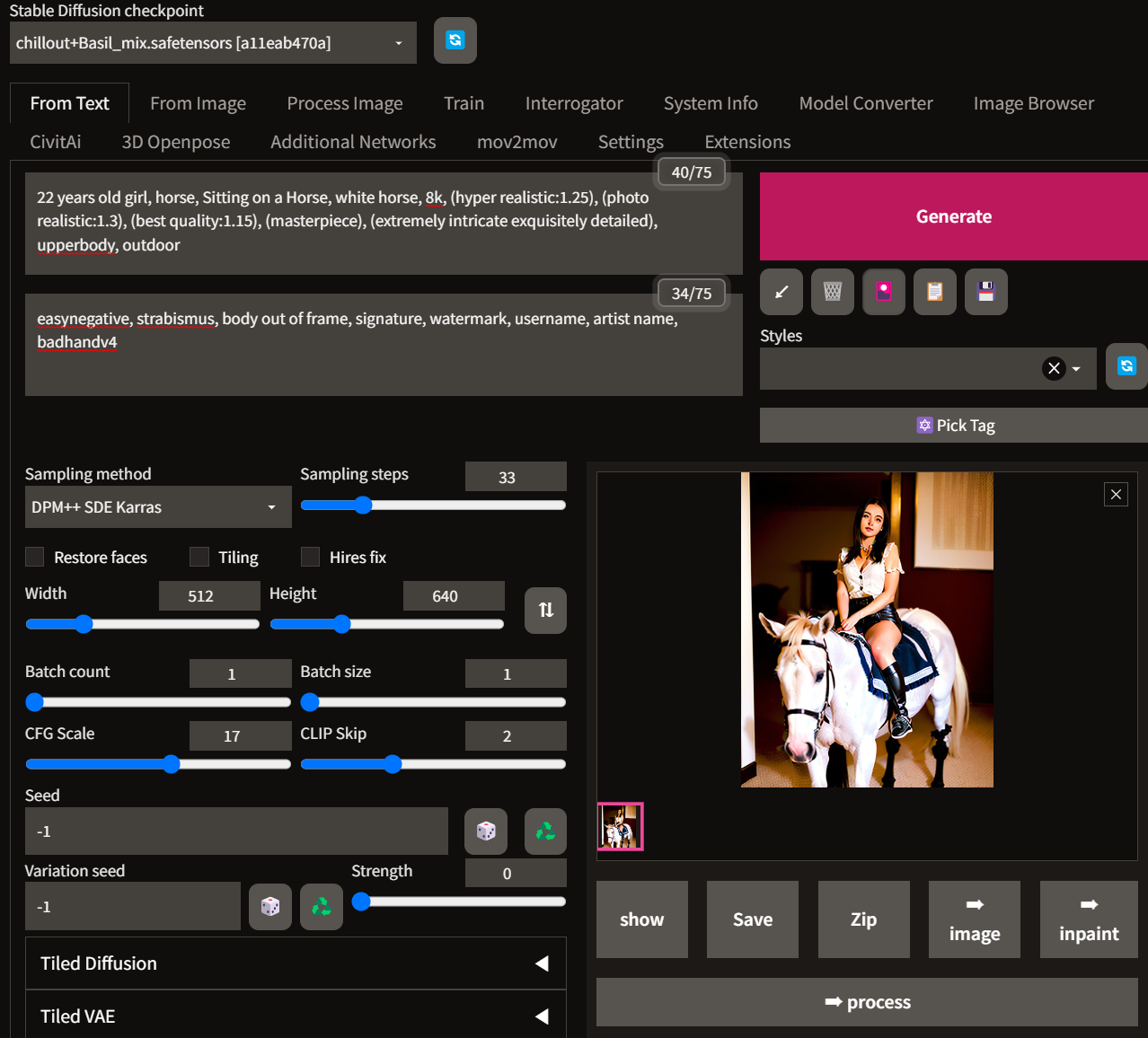 우선 기본적인 프롬프트만 주고 러프하게 이미지를 생성해보았습니다. Hires fix도 체크 안 했으니 화질도 떨어질뿐더러 얼굴의 세부 디테일도 살아 있지가 않네요.